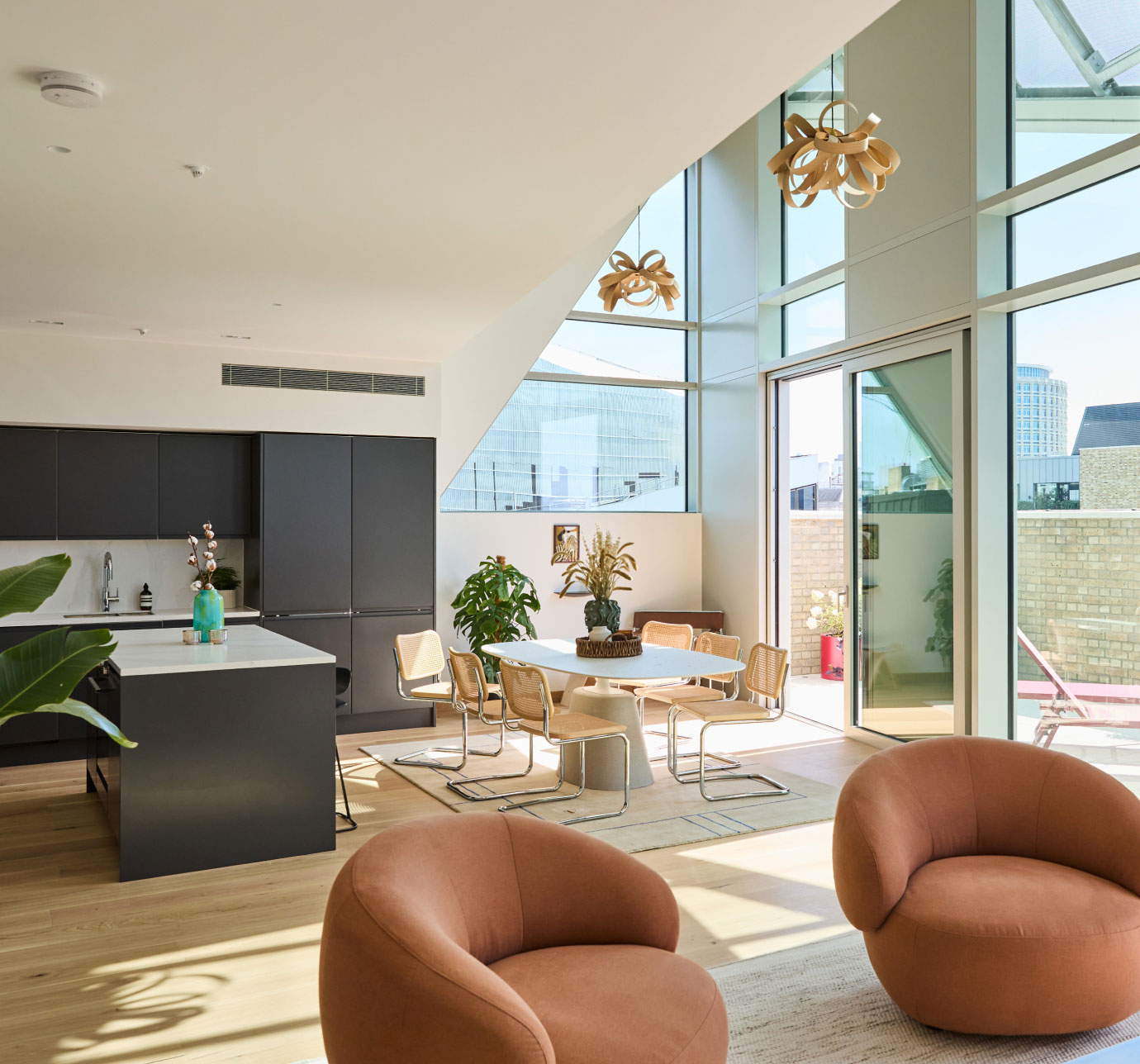 Sliding glazed doors open to a connected private terrace, offering exceptional east-to-west panoramic views over the surrounding streets and rooftops of Covent Garden and Seven Dials. From the mezzanine level above, the principal bedroom suite offers a calming space with commanding views, a generous separate dressing area and contemporary en-suite bathroom.